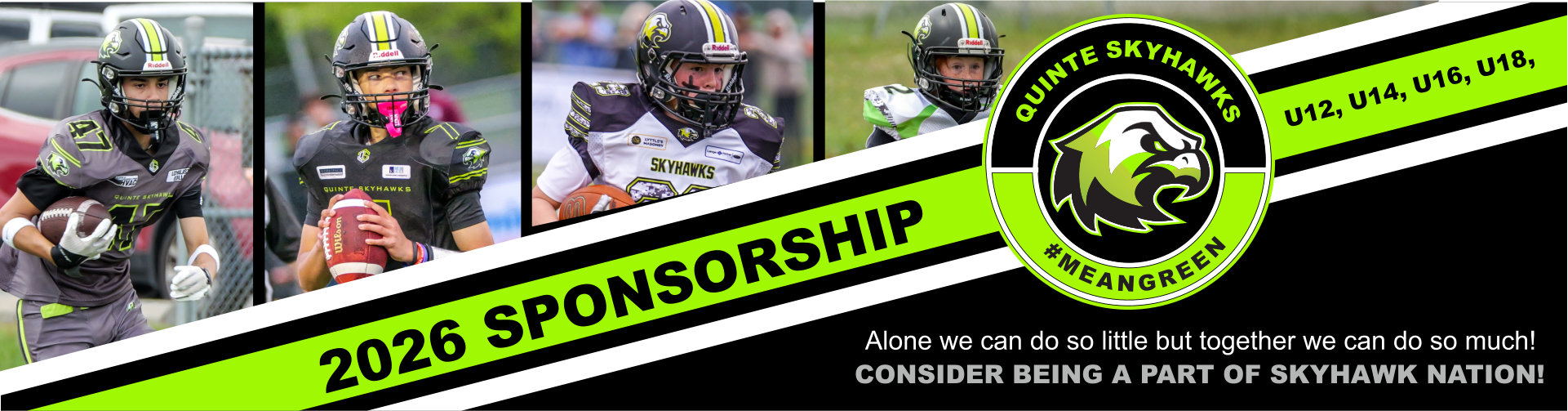 Our sponsorship packages provide individuals and companies with a variety of opportunities to promote your involvement within the community and showcsse your support for the Quinte Skyhawks football organization. Your sponsorship reaches 5 uinque audiences across the spring, summer and fall months, extending to Skyhawks families, game day spectators and residents within our surrounding communities. For more information please reach out to Jamie Guinchard at jamie@skyhawksfootball.ca.